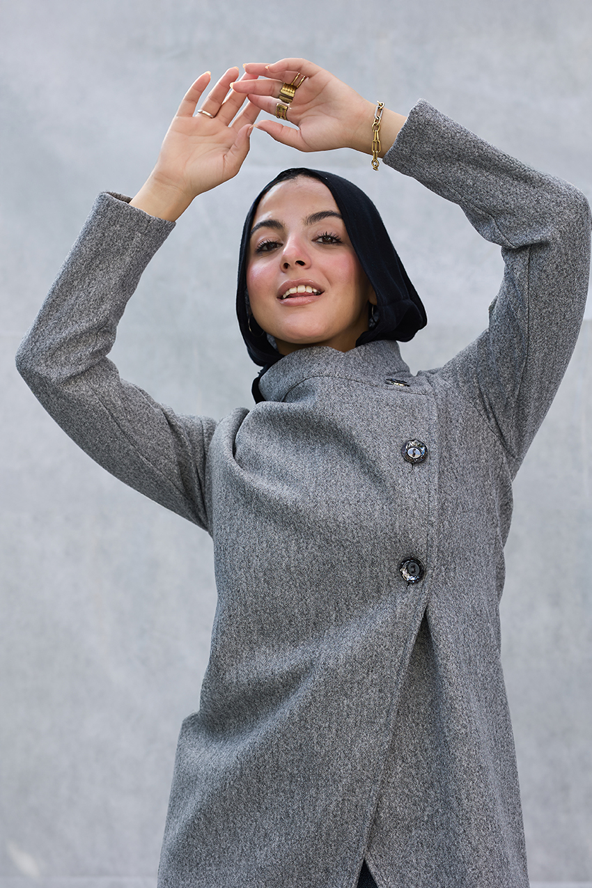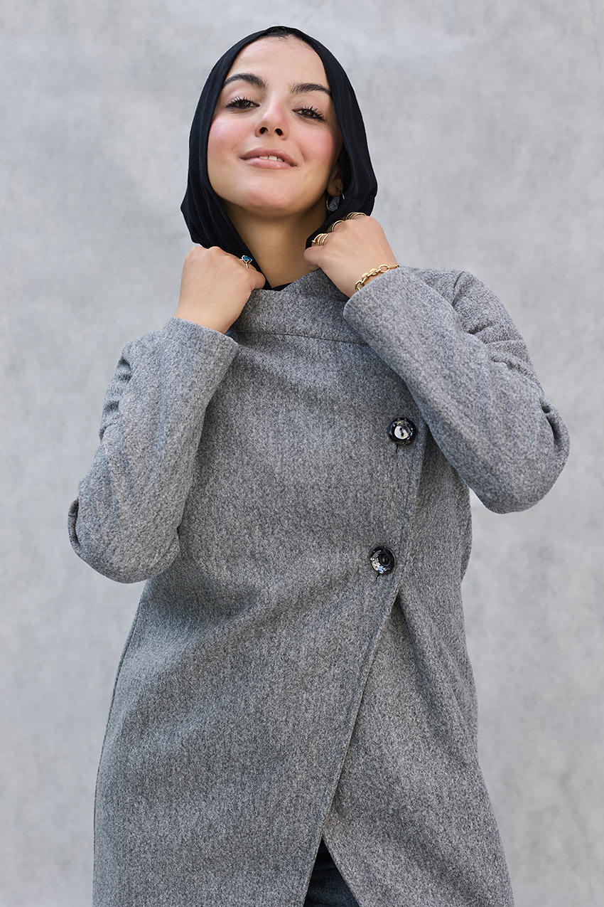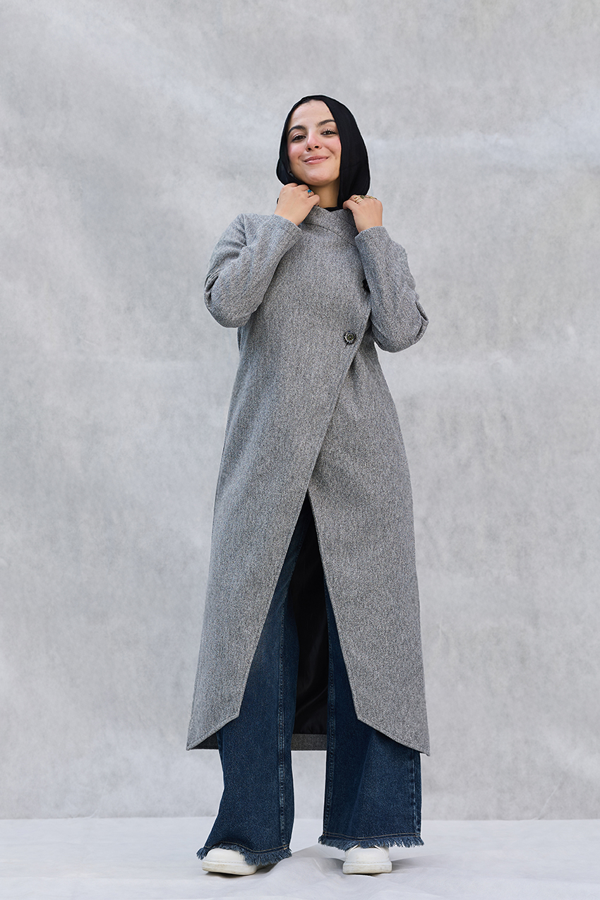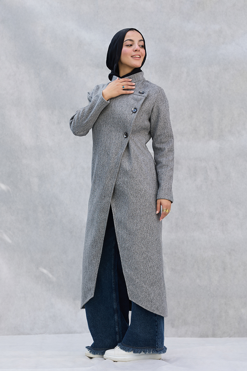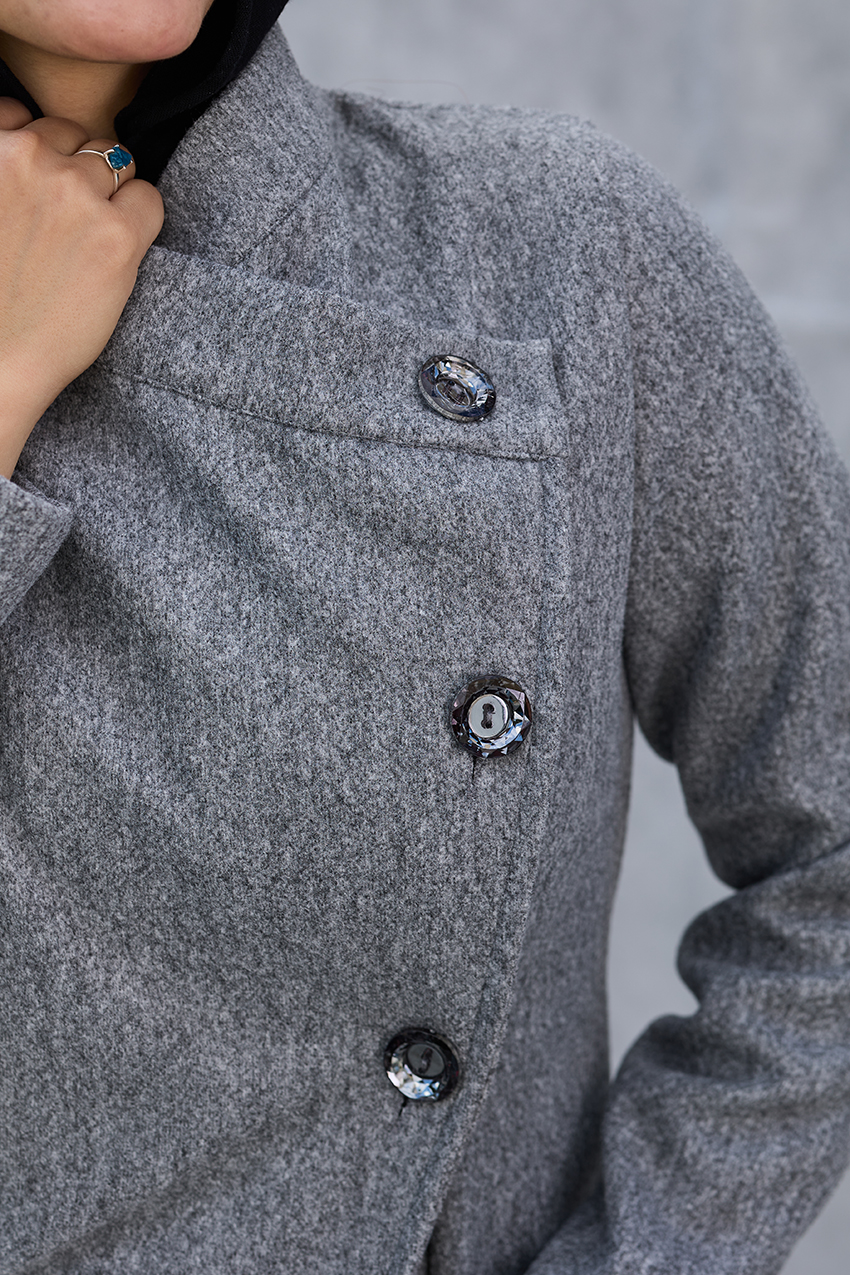 Leveled tailored coat with overlap closure detail