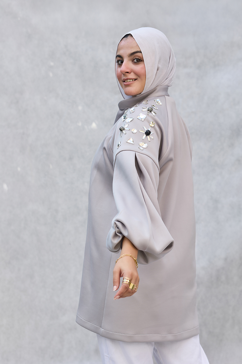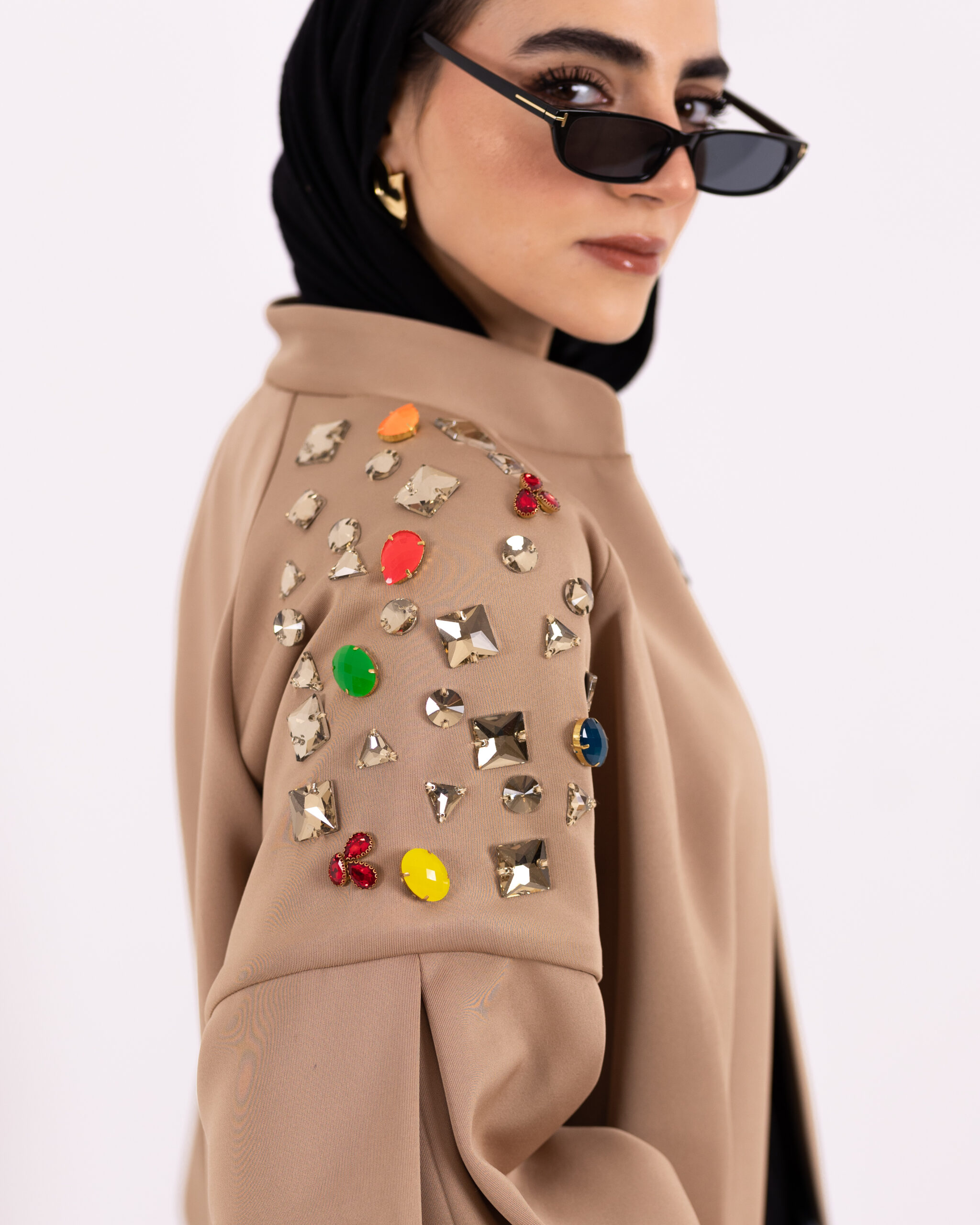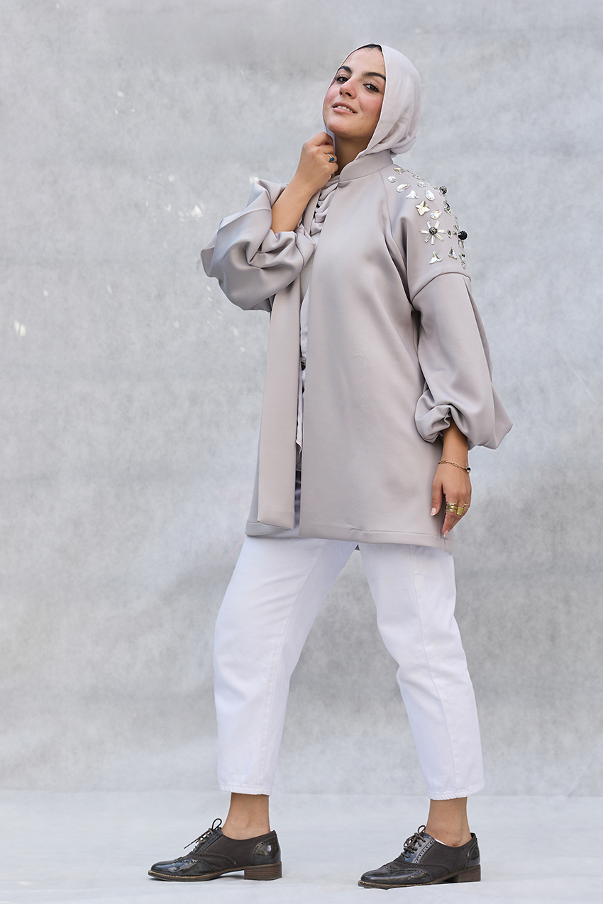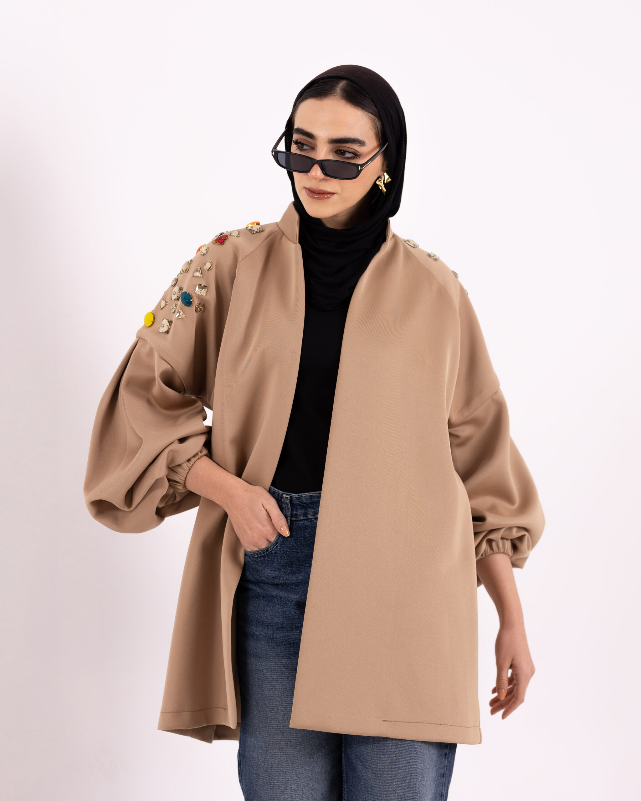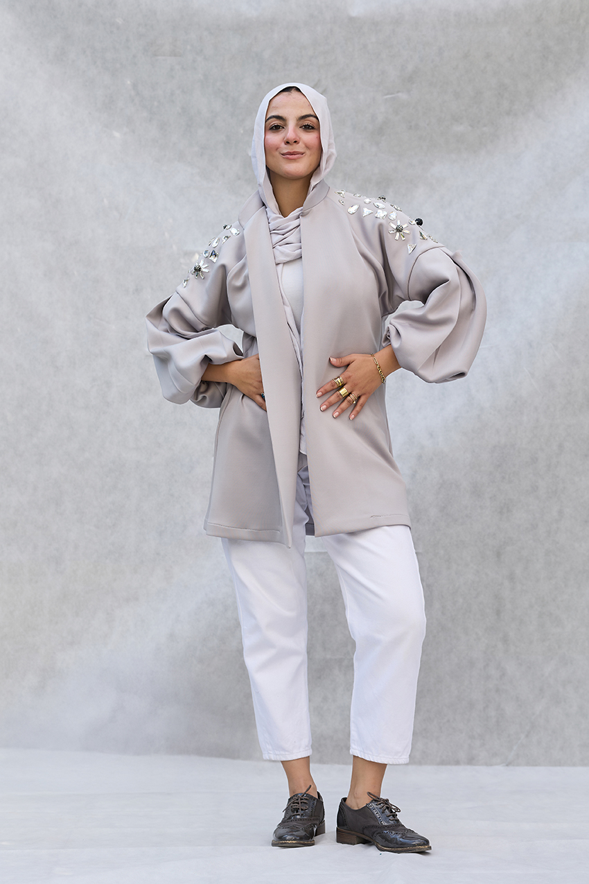 oversized puffy sleeves jacket with hand made crystal emblishments