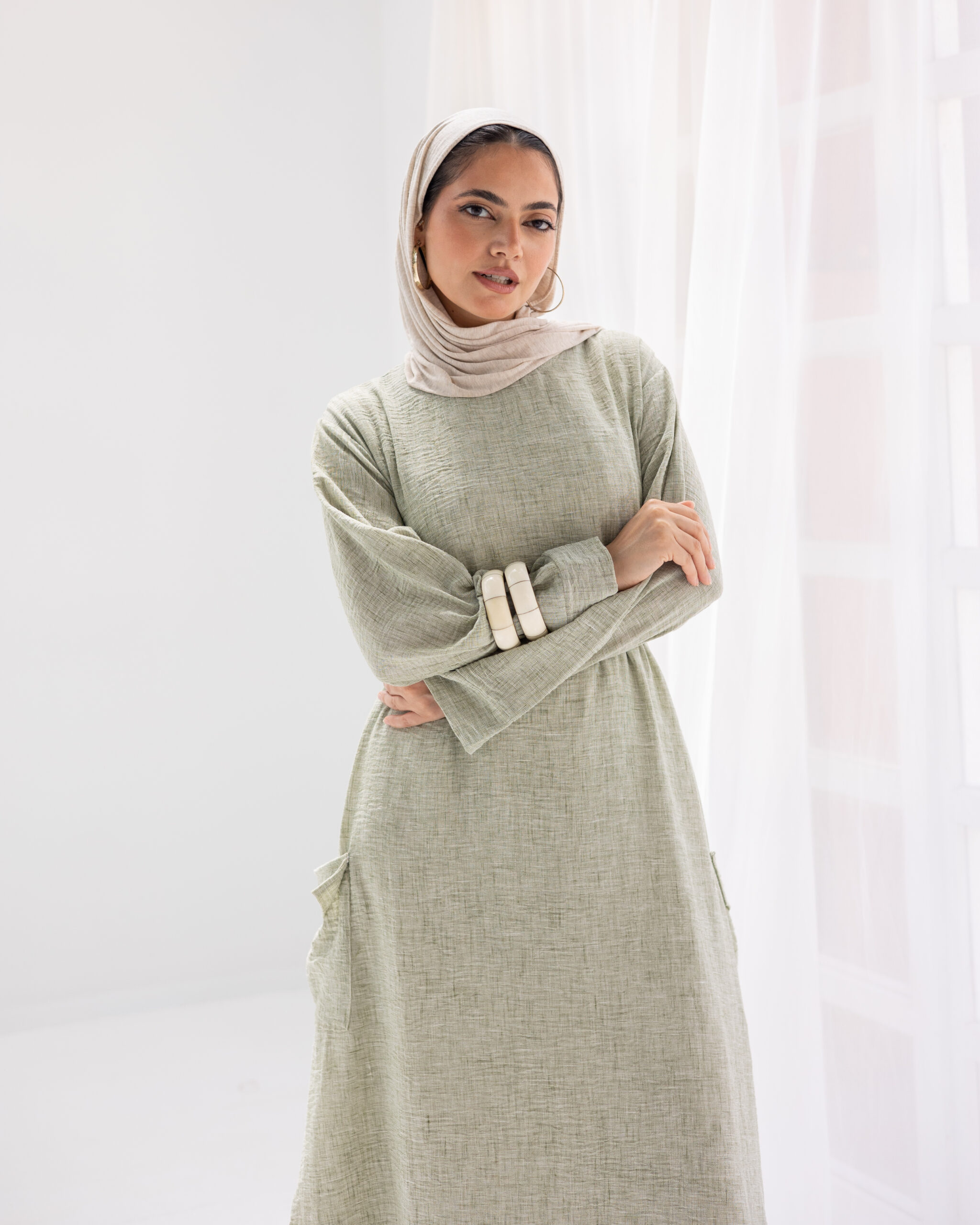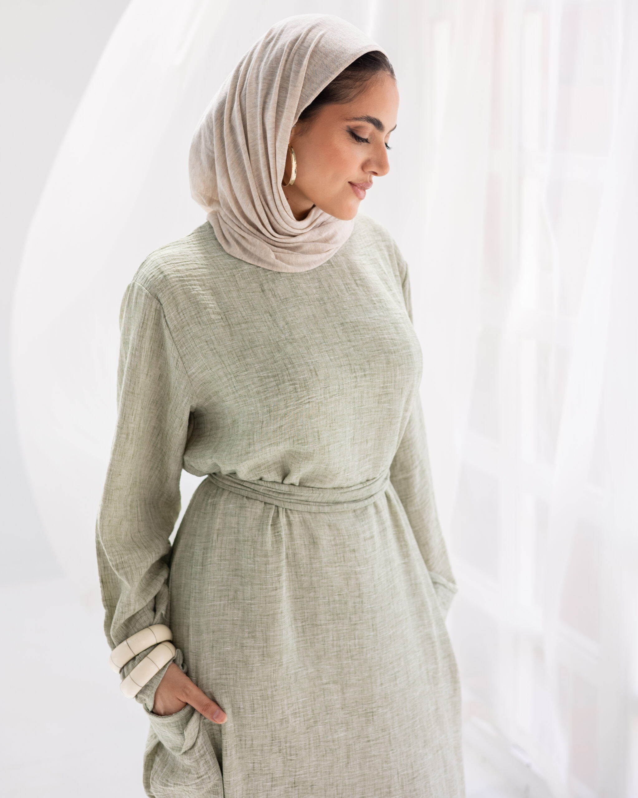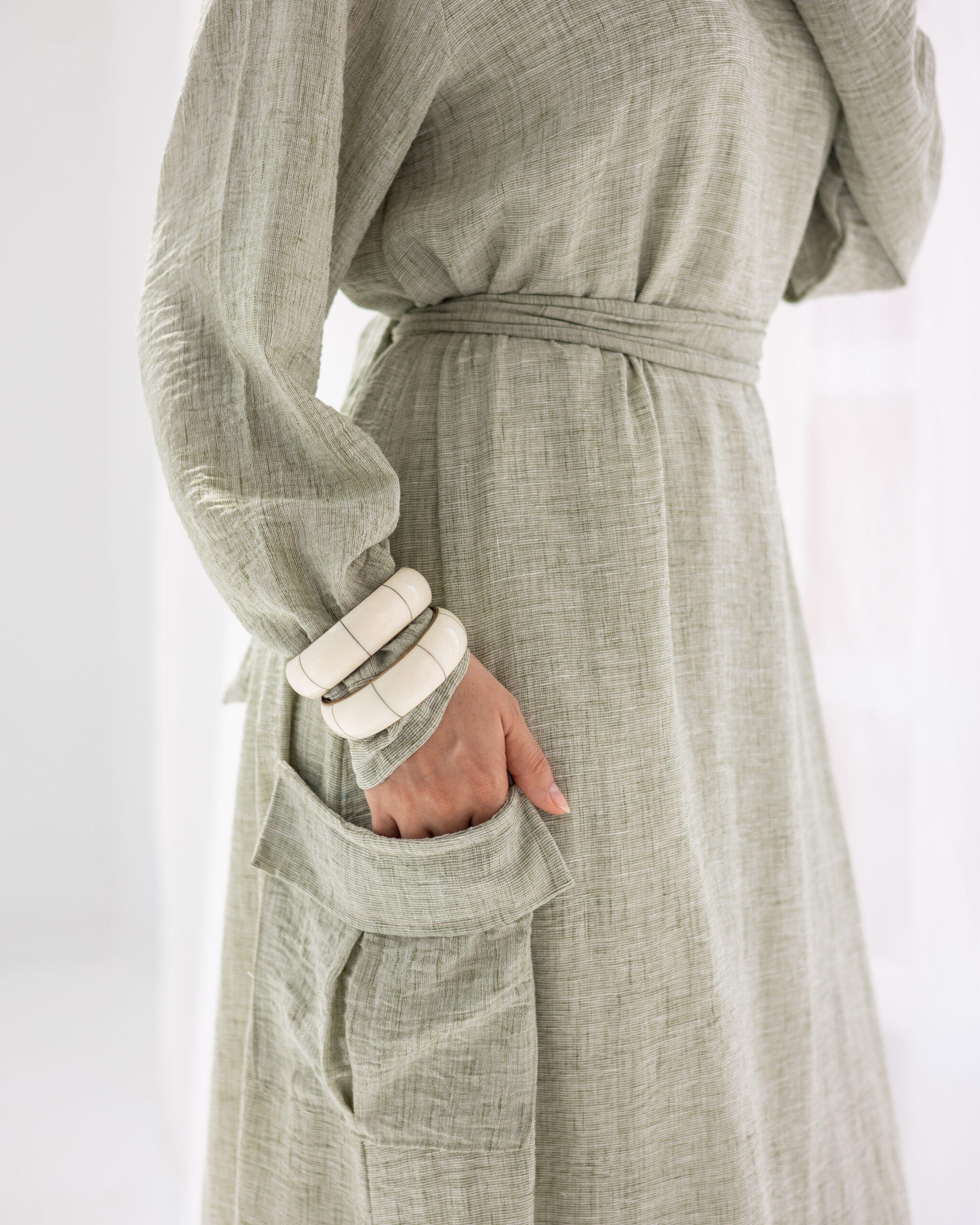 Minimal and versatile, this linen dress features deep patch pockets and an easy silhouette. A refined essential for graceful, grounded days.