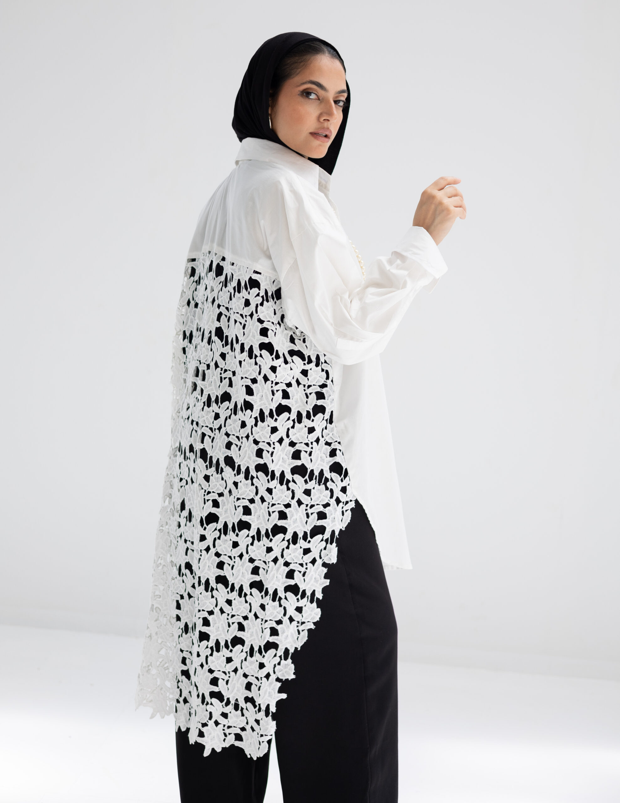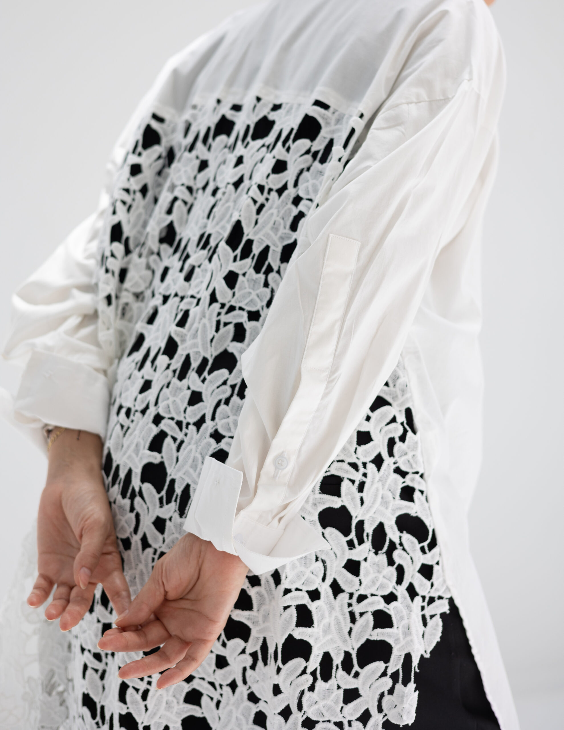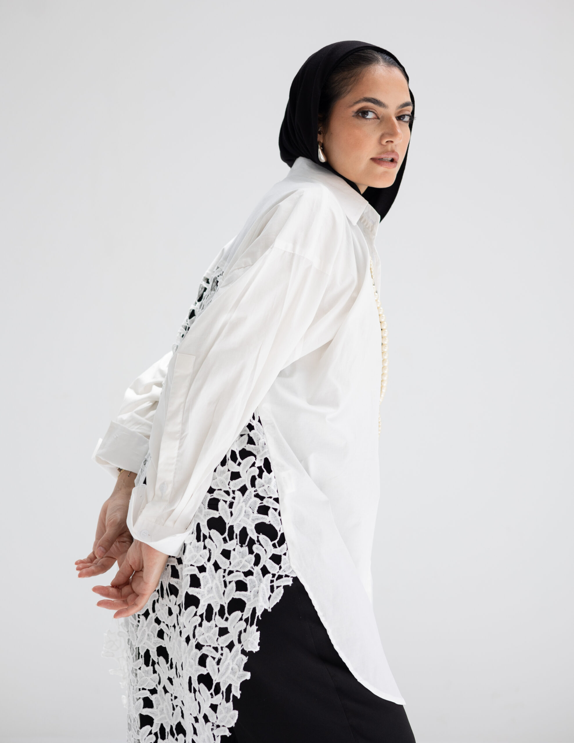 Delicate yet defined, the Whisper Shirt blends structured poplin with intricate guipure lace for a look that speaks in soft detail. The crisp lines of the shirt are balanced by the femininity of its lacework—creating contrast, harmony, and quiet allure. Tailored to flatter and designed to layer beautifully, it’s a piece that transitions effortlessly from day to evening. A standout from Everyday Grace – Wave II, Whisper is elegance, reimagined.