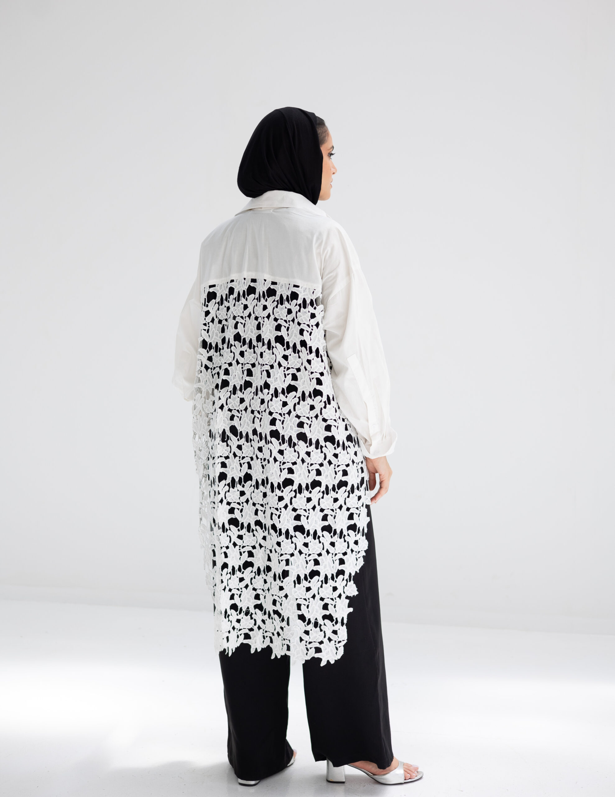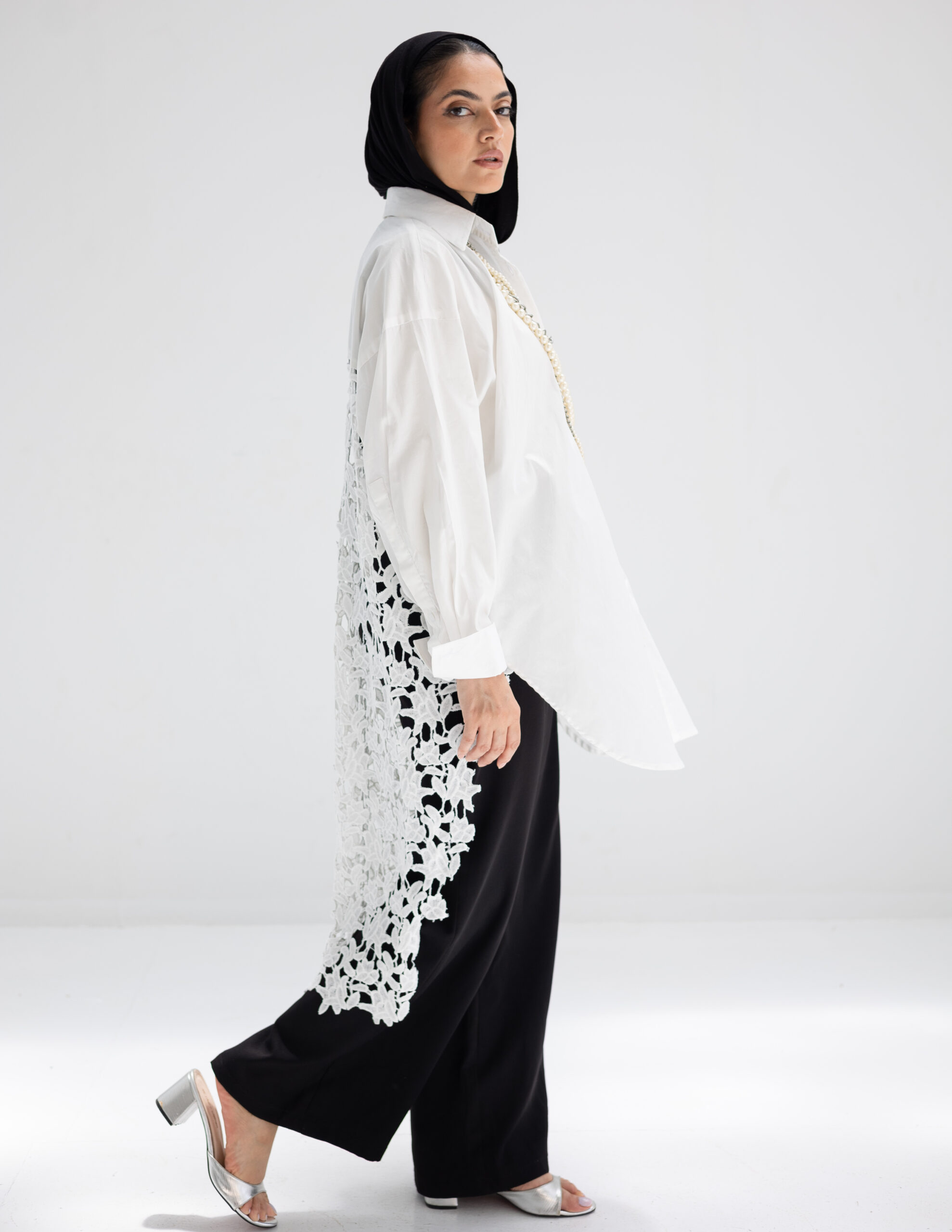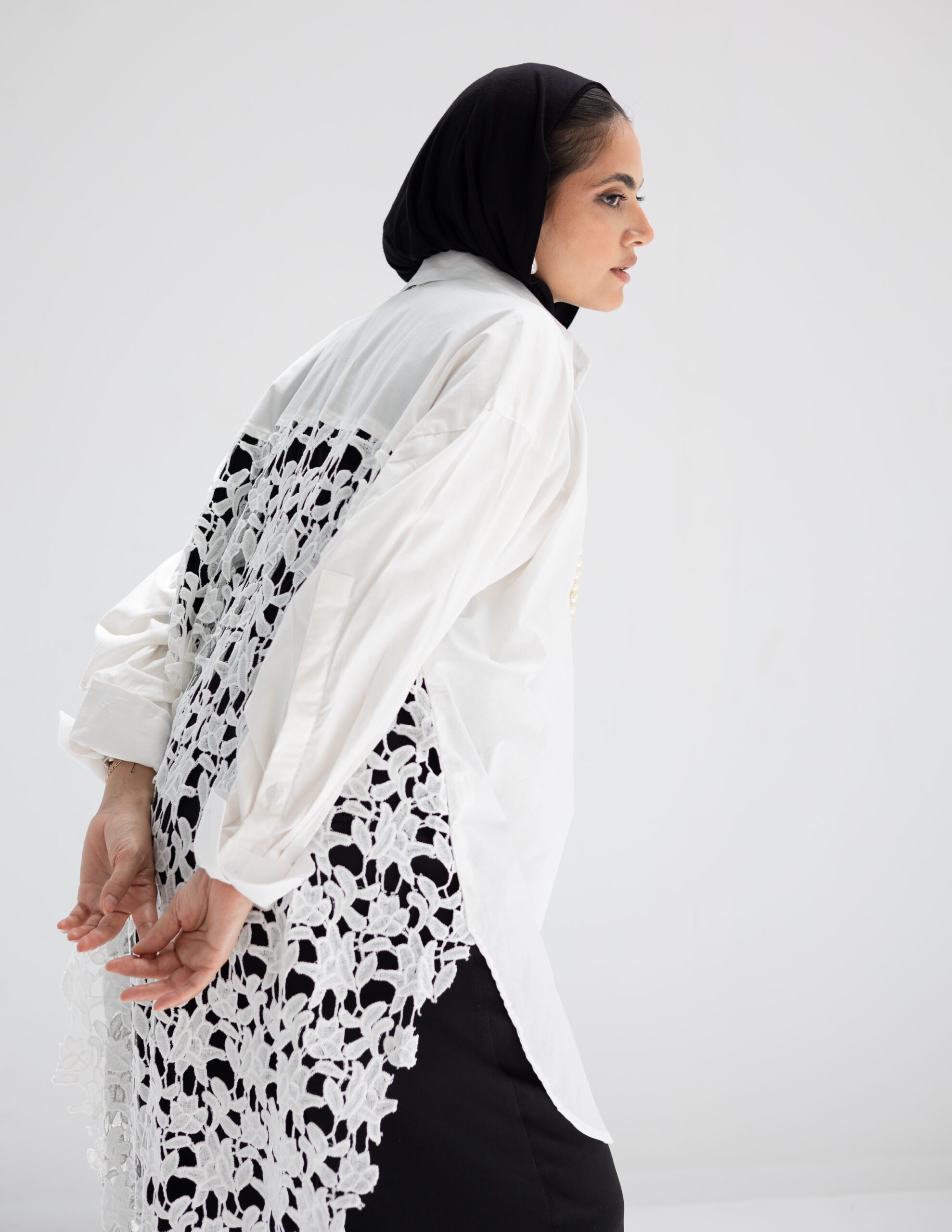 Delicate yet defined, the Whisper Shirt blends structured poplin with intricate guipure lace for a look that speaks in soft detail. The crisp lines of the shirt are balanced by the femininity of its lacework—creating contrast, harmony, and quiet allure. Tailored to flatter and designed to layer beautifully, it’s a piece that transitions effortlessly from day to evening. A standout from Everyday Grace – Wave II, Whisper is elegance, reimagined.